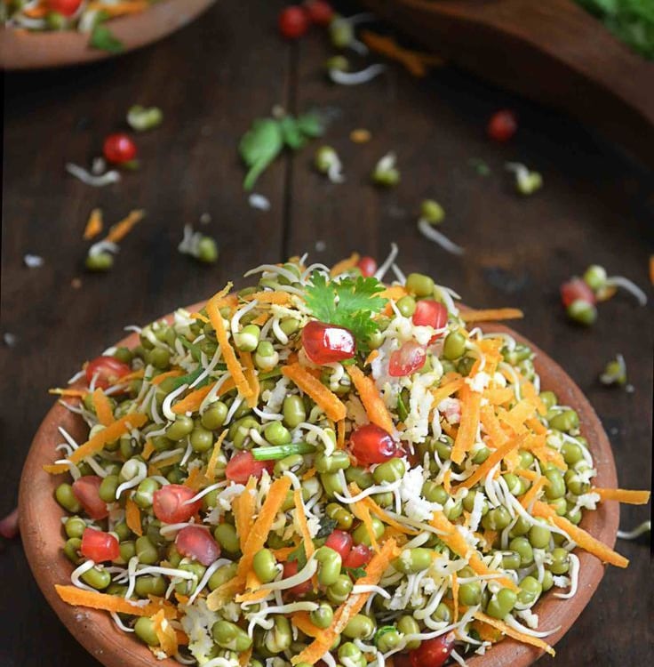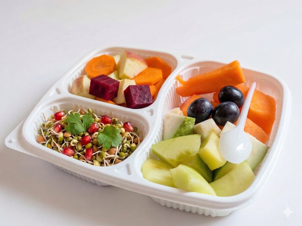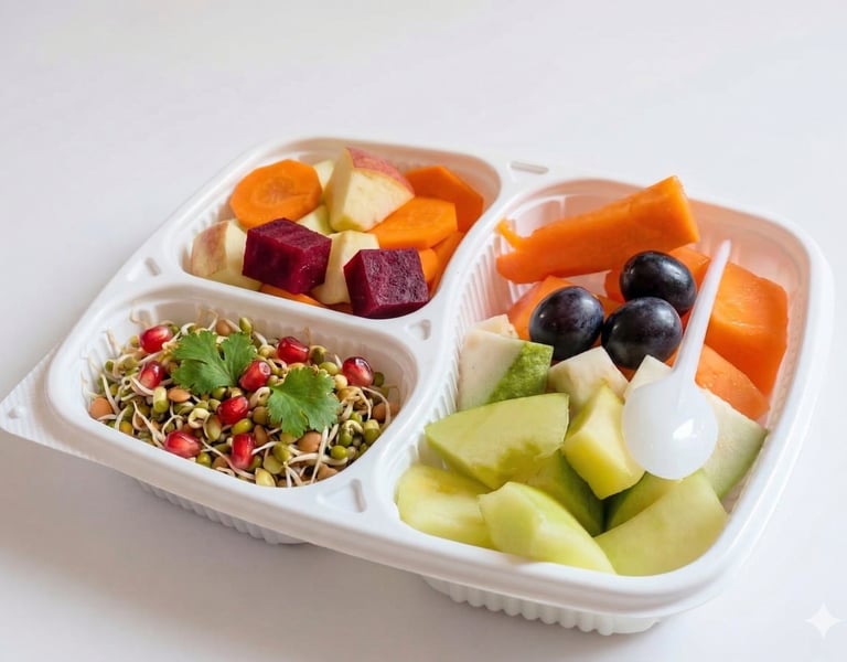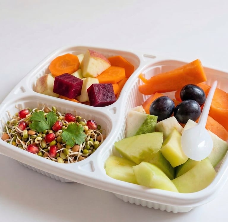 Daily mix of fresh fruits, sprouts and salads.